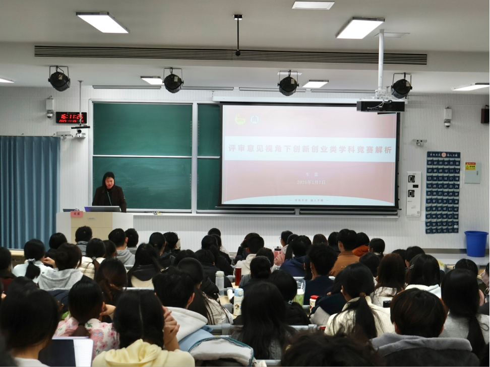 讲座现场,车霖结合多年指导学生参赛的丰富经验,为在场同学带来了一场内容翔实的指导。他首先介绍了“挑战杯”中国大学生创业计划竞赛(“小挑”)的发展历程,聚焦备赛核心环节,详细讲解了评审规则、项目选题策略、商业计划书撰写要点及路演答辩技巧。建议同学们,选题要紧扣“科技创新与未来产业”“乡村振兴与农业农村现代化”等五大方向,善于从国家战略中寻找灵感,并结合专业优势挖掘创新点。团队组建应注重跨专业协作,规模控制在10人以内,明确分工,建立高效沟通机制。通过剖析往届金奖项目,向同学们强调了“创新性与实践性并重”备赛核心理念。一份出色的商业计划书需清晰呈现“痛点方案成果”逻辑链,包含翔实市场分析、可行商业模式和周密风险预案。