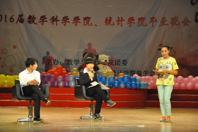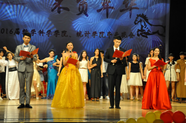 全体师生对2012级毕业生致以热烈的祝贺和衷心的祝福。随着红色幕布缓缓升起,超级放克舞团充满青春活力的开场舞表演激起了同学们的声声尖叫,掀起了晚会的第一个高潮。在主持人诙谐幽默的台词串联下,晚会顺利进行着。本次晚会精彩不断,相声小品演员不顾形象的幽默表演,街舞、拉丁精彩优美的舞姿和歌手们婉转动听的歌声都赢得了观众的阵阵掌声。晚会的又一热潮源自于在钢琴与二胡声中送出美好祝愿的任课老师代表,他们的谆谆教导令同学们潸然泪下,展现了浓厚融洽的师生情。在歌曲《友谊地久天长》的优美旋律中,全体表演者走上舞台,向大家挥手告别,晚会圆满结束。