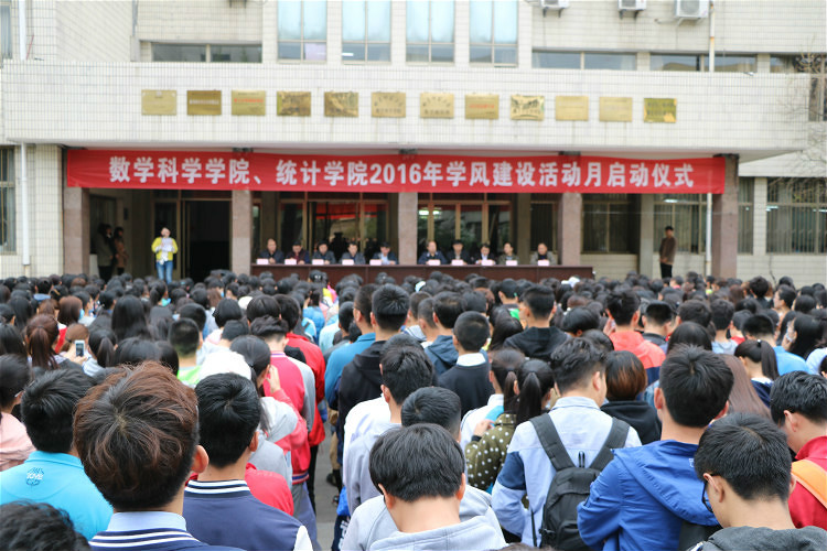2015-2016学年第二学期学风建设活动月于数学教学楼正式启动。出席启动仪式的领导和嘉宾有:学生工作处处长杨永明、招生就业处处长郭庆兵、校团委副书记孔轶众、数学与统计足球吧