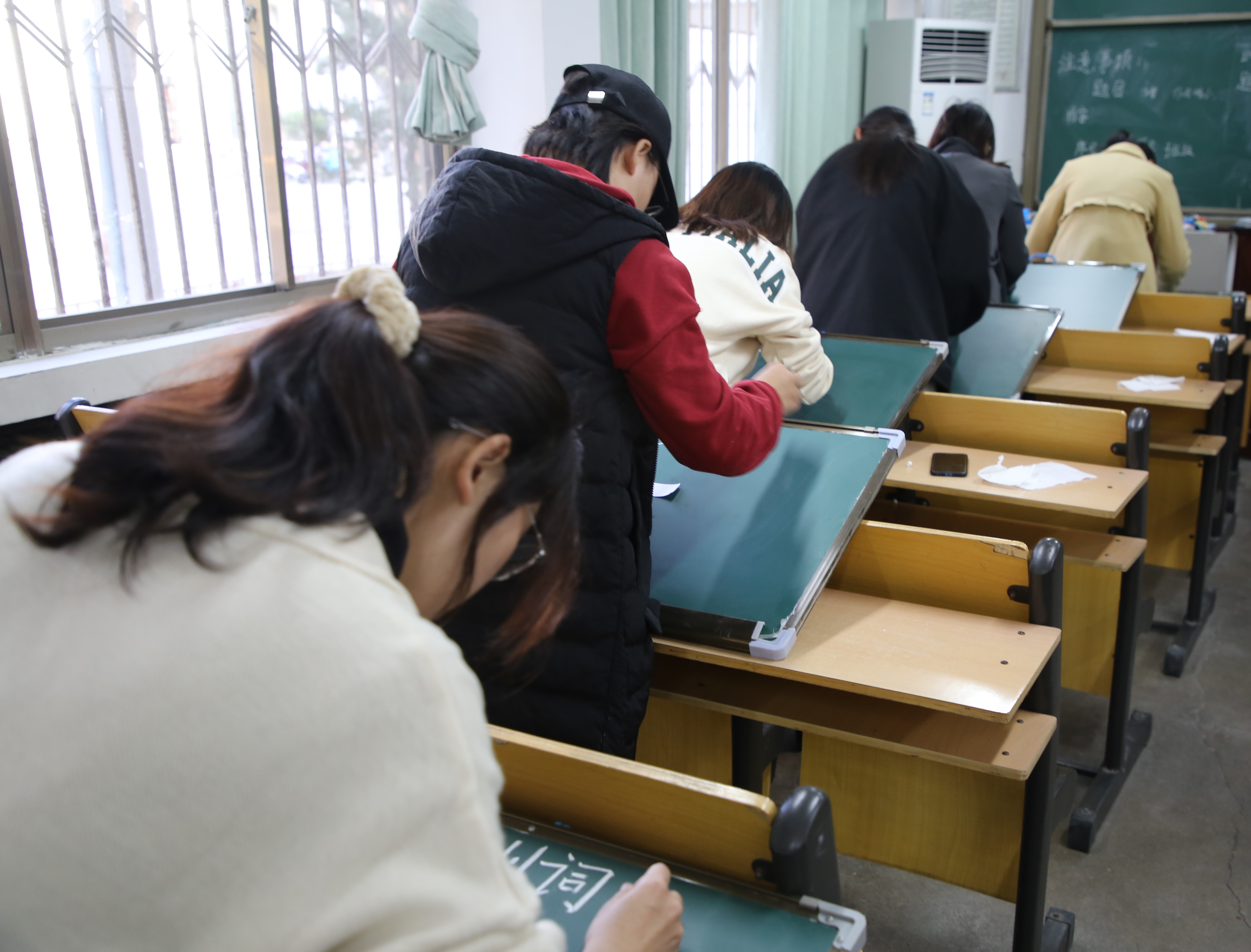 大赛有条不紊地进行,钢笔字、毛笔字、粉笔字赛场分别被安排在不同的教室中进行。纪检部、学习部的成员负责讲解比赛规则及注意事项,他们秉持“公正、公开、公平”的原则进行监考。参赛成员在赛场上不慌不乱、沉着冷静,他们将自身对书法的情感领悟倾注在一笔一划中,娴熟的手法与优美的诗句结合,黑板、纸张上栩栩如生的文字彰显着他们自信的姿态。
