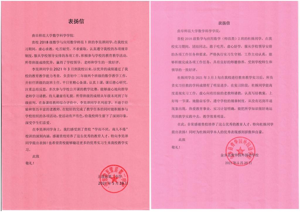 寄来了感谢信,分别对在该校实习的李昊泽、杜姝同学提出了高度表扬。