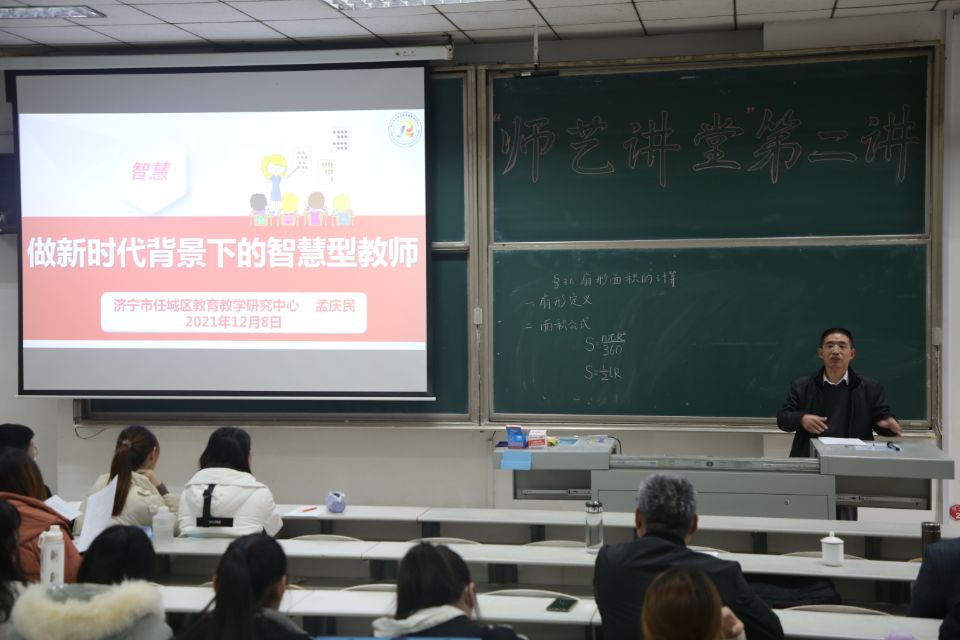 本次讲堂由2019级师范生邓佩颖、宋亚坤两位同学分别进行一元二次不等式及其解法、弧长及扇形面积计算的课堂模拟教学,指导教师分别为冯振举、张彬老师;济宁市任城区教育教学研究中心初中教研室主任,数学教研员,高级教师,市教学能手,市骨干教师,济宁市数学教育学会副秘书长,济宁市有突出贡献的中青年专家孟庆民老师进行课堂点评。点评结束后,孟庆民老师为大家做《做新时代背景下的智慧型教师》专题报告。