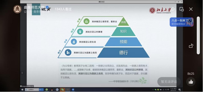 本次“师德公开课”采取线上直播的形式,主要分为三部分:蔡元培生平、蔡元培的教育及美育思想和蔡元培的教育思想对当代的启示。蔡磊砢女士围绕教育应该以人为本展开叙述,对体魄、知识、技能、德行提出相应要求,既带我们展望了蔡元培先生积极投身教育的一生,也为当代我们更好的投身教育事业指明了前进的方向。
