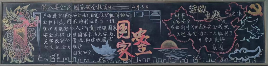 团委的号召下,同学们积极参与主题板报设计制作,通过各种途径搜集相关知识,加深自己对于国家安全的理解。在黑板报绘制过程中,同学们自己动手,查询相关国家安全文献,充分利用黑板报用心构思,利用图画、美术字等艺术形式对黑板报进行了精心设计,体现了国家安全鲜明主题,既达到了宣传、教育目的,又提高了同学们动手动脑的能力,起到了很好的校园安全教育宣传作用。
