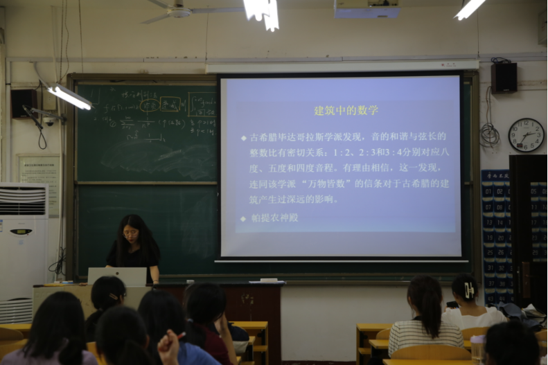 本次活动围绕不同领域中的数学展开叙述,带同学们见识了数学多元的发展。宣讲同学通过PPT,分别从文学作品中的数学、建筑中的数学、名画中的数学、战争中的数学等方面,介绍著名数学定理与生活点滴的联系,举例名人事迹,展示经典作品,呈现艺术绘画,让同学们更好地体会了数学之美。最后,宣讲人走进生活,举例全等,从古代水准仪到土地丈量,同学们感受到数学独特的魅力,将耳熟能详的数学知识与实际生活联系到一起。