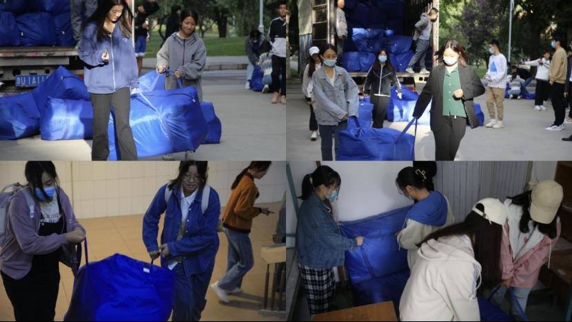 的学生党员、入党积极分子以及学生志愿者,于9月5日清晨来到新生学生公寓,完成了2023级新生被褥的搬运分发工作。