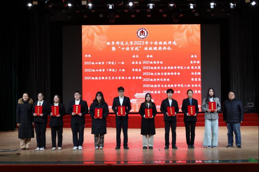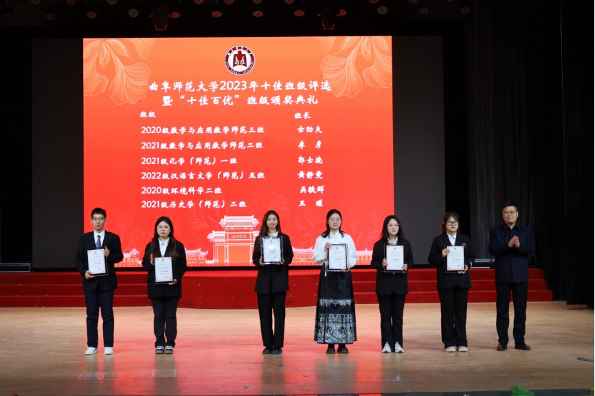 的3个“十佳候选班级”以PPT讲演与才艺展示相结合的方式,将班级锐意进取的精神和团结一致的风采展现得淋漓尽致。最终,2020级数学与应用数学师范三班和2021级数学与应用数学师范二班分别以曲阜校区第一名和第二名的成绩被评为2023年“十佳班集体”。2022级数学与应用数学师范3班作为“十佳候选班级”也取得了曲阜校区第八名的好成绩。