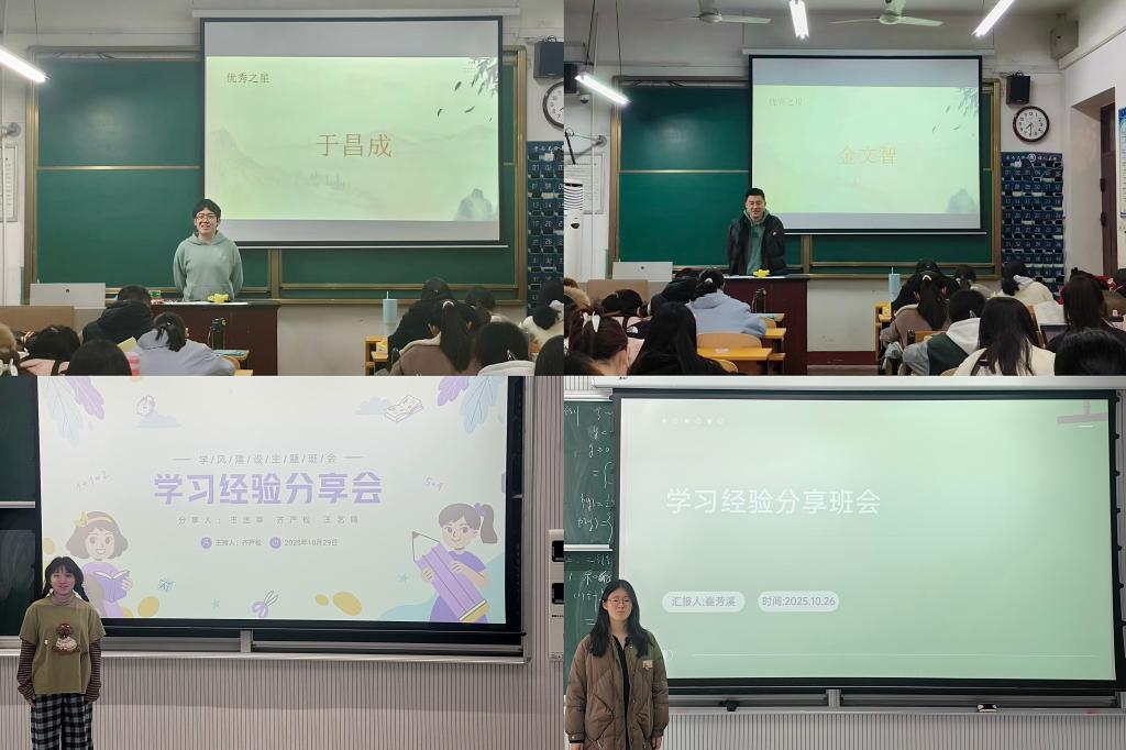 各班班团干部精心策划,围绕学风建设主题组织召开班会,邀请本班评选出的两名“优秀学生”和两名“进步之星”进行现场分享。“优秀学生”结合自身长期的学习实践,从专业课程学习、高效学习方法、时间管理策略等方面,系统分享了如何稳定保持优异成绩的核心经验;“进步之星”讲述了从“学习迷茫”到“找到节奏”的转变历程,分享了调整学习心态、克服困难、实现学业突破的真实感悟与实用技巧。分享过程中,同学们认真聆听,在互动环节踊跃提问,积极交流学习中的困惑与心得,现场气氛热烈,激发了同学们学习的热情。
