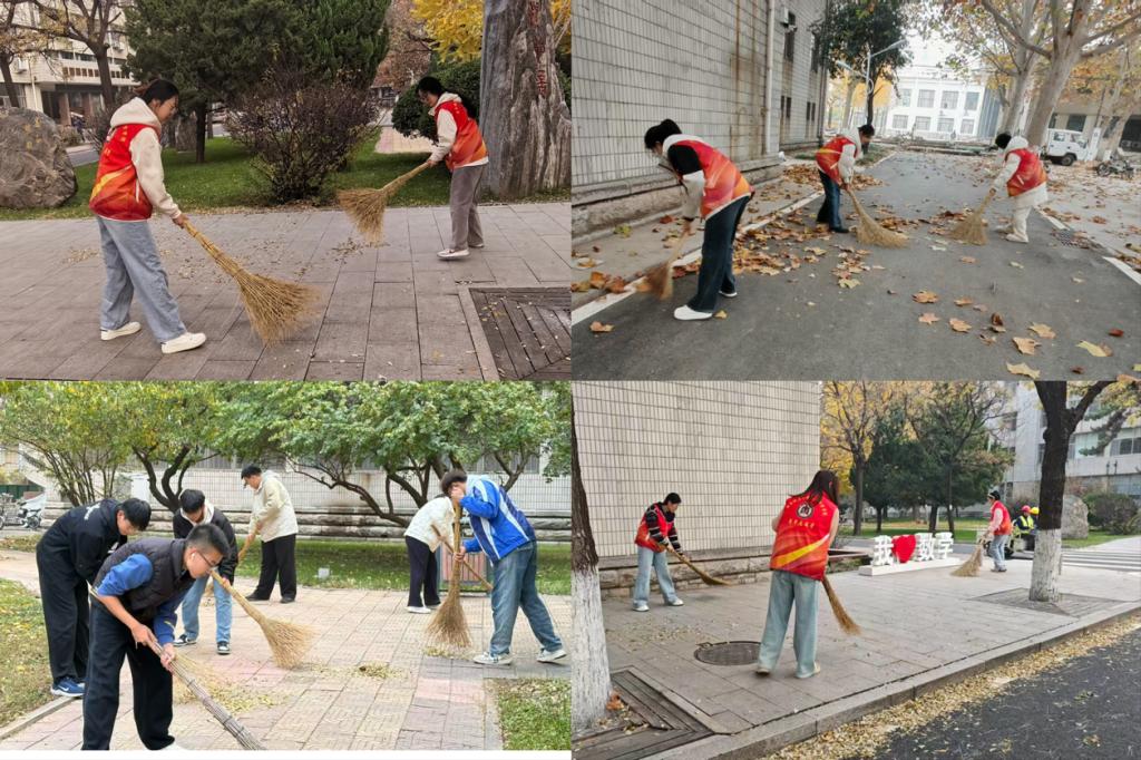 活动当天,同学们手持各种扫帚工具,分组前往校园步道、校园活动广场教学楼前等落叶集中区域,分工协作清理散落的落叶。大家弯腰细致清扫、有序归集落叶,忙碌的身影与秋日暖阳相映成趣。