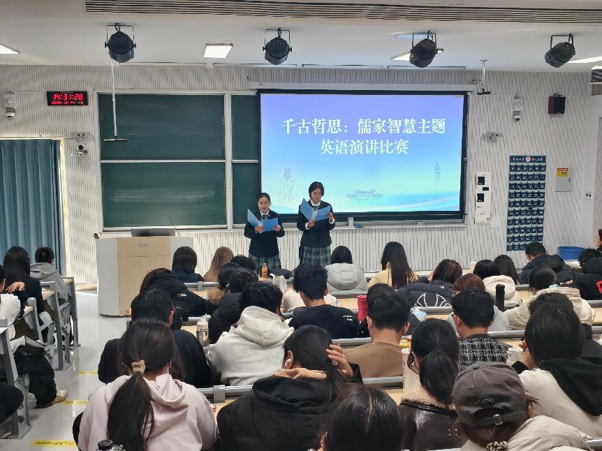 在数学楼201举办了“千古哲思:儒家智慧”主题英语演讲比赛。此次活动邀请到的评委老师有中外合作办学项目办公室主任王竹玉和外教老师Lizelle。