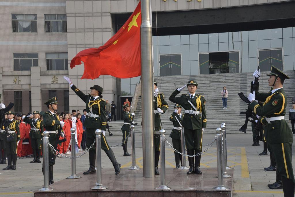 国旗护卫队成员迈着铿锵有力的步伐,喊着响亮的口号向国旗杆走来,五星红旗在雄壮的国歌中冉冉升起。随后面向象征热血与青春的团旗,足球吧