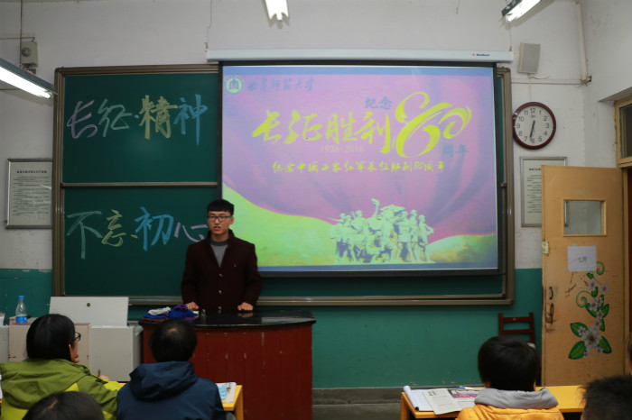 班会伊始,各位班长、团支书向同学们介绍了长征的历史背景、行军路线、价值意义,通过文物照片和途径地点的今昔对比,再现当时红军战士艰苦的生活条件。随后,同学们观看了一段历史影片《亮剑》,其跌宕起伏的情节成功引发了同学们的爱国热忱。班会最后,同学们上台发表感言,大家纷纷表示受益匪浅,并承诺在今后的学习和生活中会发扬和传承长征精神,不忘初心,勇敢前行。