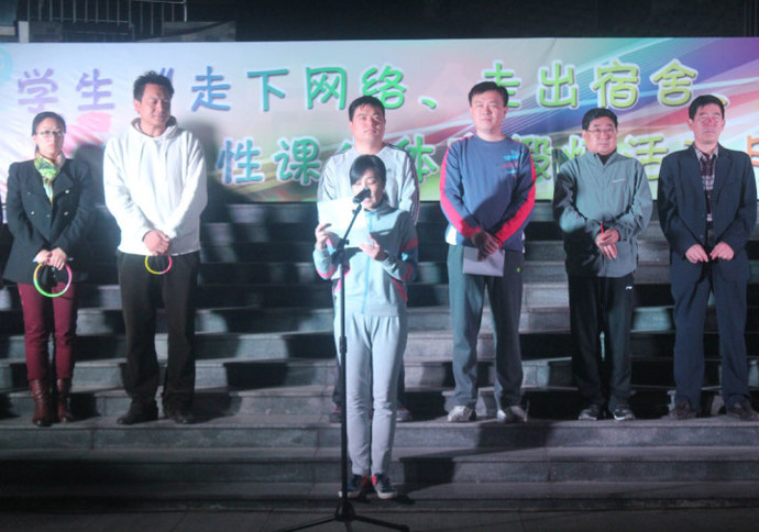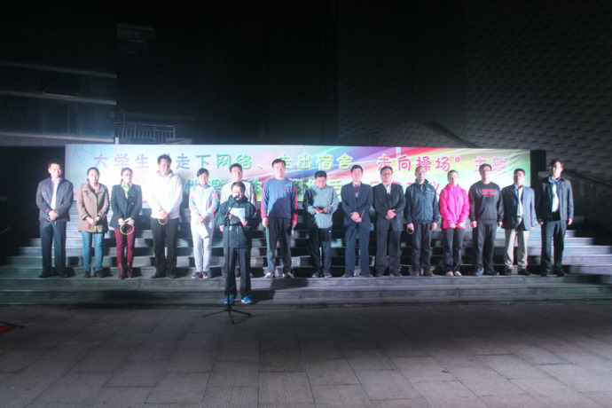 20141030日晚,足球吧 在大学生活动中心前举办“走下网络、走出宿舍、走向操场”主题群众性课外体育锻炼活动月启动仪式和环校彩虹跑活动。校党委副书记孙文亮教授,学生工作处处长杨永明老师,团委书记屈跃宽老师,保卫处副处长姜开勇老师,体育教研部副主任李大新老师,团委副书记张明洁老师出席本次会议。足球吧 团总支书记朱伟卫老师亲临现场,足球吧 众多学生到场参与本次活动。