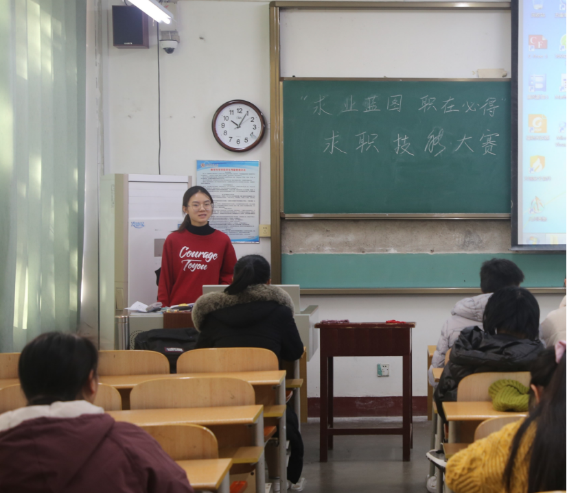 以“求业蓝图,职在必得”为主题的求职技能大赛于数学楼104室开展。学院学生会主席谢锡源,就业实践部副部长朱诺、孙周同担任本次比赛的评委。