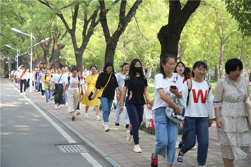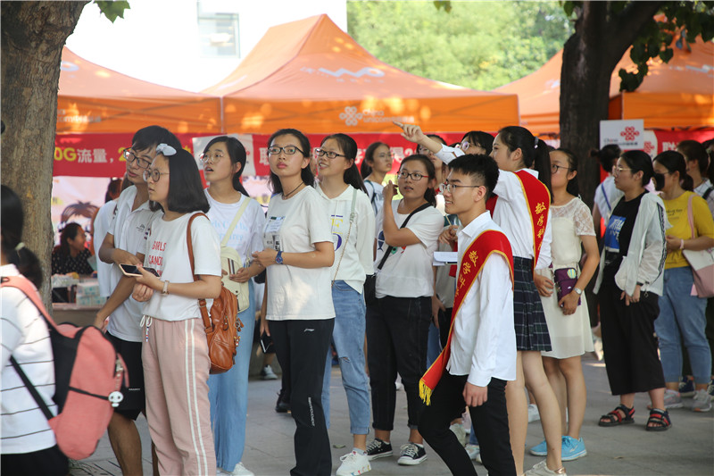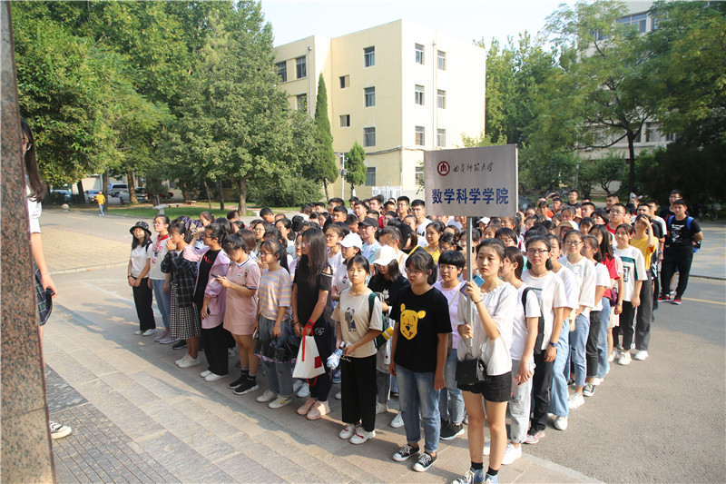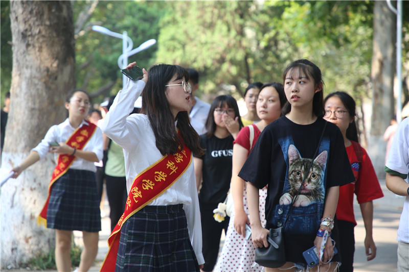 学生会的成员组成的志愿者服务队带领2019级新生游园。