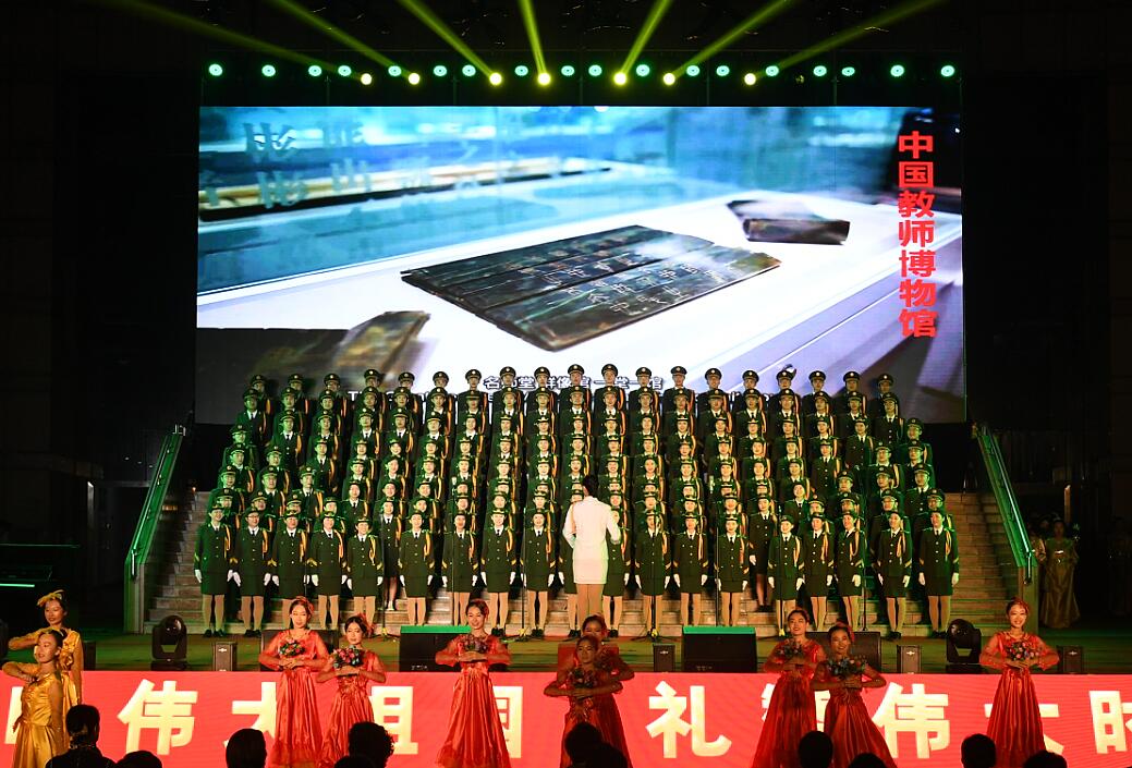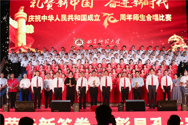党委组织师生代表以《共筑中国梦》、《当那一天来临》两首歌曲深情道出对祖国的无限热爱,气势恢宏,旋律昂扬,演绎了时代精神,礼赞了新中国取得的辉煌成就。现场的观众们手持五星红旗,伴随着歌声左右挥舞,为各学院合唱团报以最热烈的掌声。整场活动精彩纷呈、高潮迭起,反映了新中国波澜壮阔的光辉奋斗历程,充分表达了曲园人的爱国之情,对伟大祖国的热爱和对美好生活的向往,彰显了曲园人奋进新时代、创造新生活的壮志豪情。