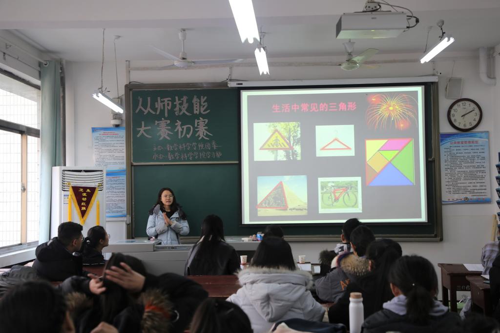 从师技能大赛初赛在数学楼203、204、207和211教室拉开帷幕。比赛由杨俊峰、尚卓群等12名同学担任评委,共计90余名学生参与此次比赛。