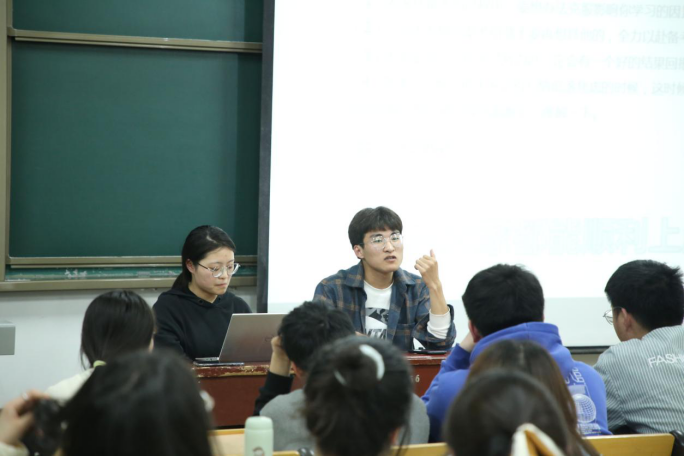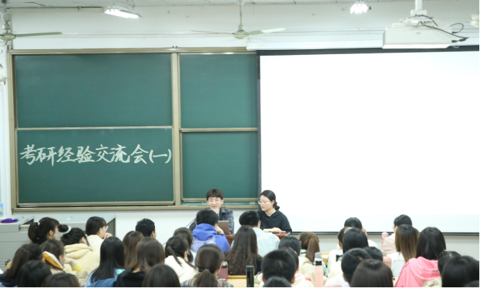 首先进行分享的是现已被湖南师范大学录取的朱礼昊。他强调每位同学都应有自己的复习计划和复习节奏,要按照自己的规划进行复习,保持好复习心态,不要受外界因素的干扰。他还强调,复习过程中选择一个好的自习室至关重要。第二位分享的是已被天津大学录取的刘瑞萌,她从自身经历出发,从生活和学习的不同方面为大家提供了切实可行的建议。她认为,考研的成功等于正确的方法、不懈的努力、良好的心态以及恰当的复习材料。他们风趣的语言、清晰的条理和开门见山的风格,赢得了学生阵阵掌声。
