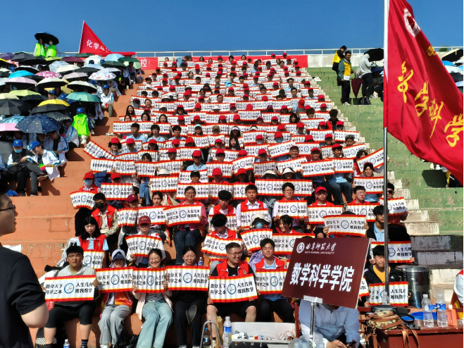 的辅导员老师们带领大家搞起了歌曲串烧,现场K歌的阵阵欢呼把观众席的热情之火点燃了。老师领唱,同学们跟随老师一齐唱歌,这才是运动会应该有的氛围,提倡的团结协作、互帮互助的“全民狂欢”。现场的气氛一度引得隔壁院系的同学一起加入;同时,赛场上的运动员也依旧斗志昂扬,不断超越自己、突破自己,从成绩中也能看出大家顽强拼搏,决不放弃的精神和在长久训练下的强大实力。