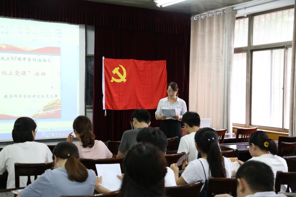 首先,党支部书记袁芳为全体党员上了一堂“青春践行十九大,坚定信念跟党走”为主题的党课,通过回顾中国共产党走过的97周年光辉历程,使全体党员深切地感受到我们党是一个经得起风浪考验、在困难挫折中奋勇前进的党;是一个富于创新精神、不断开拓进取的党;是一个为中国人民谋幸福、为中华民族谋复兴的党。袁芳强调,身为新时代的研究生党员,要热爱党、拥护党、听党话,坚定理想信念跟党走,认真学习和贯彻十九大精神,领悟和践行习近平新时代中国特色社会主义思想,用青春和热血谱写人生新的篇章。