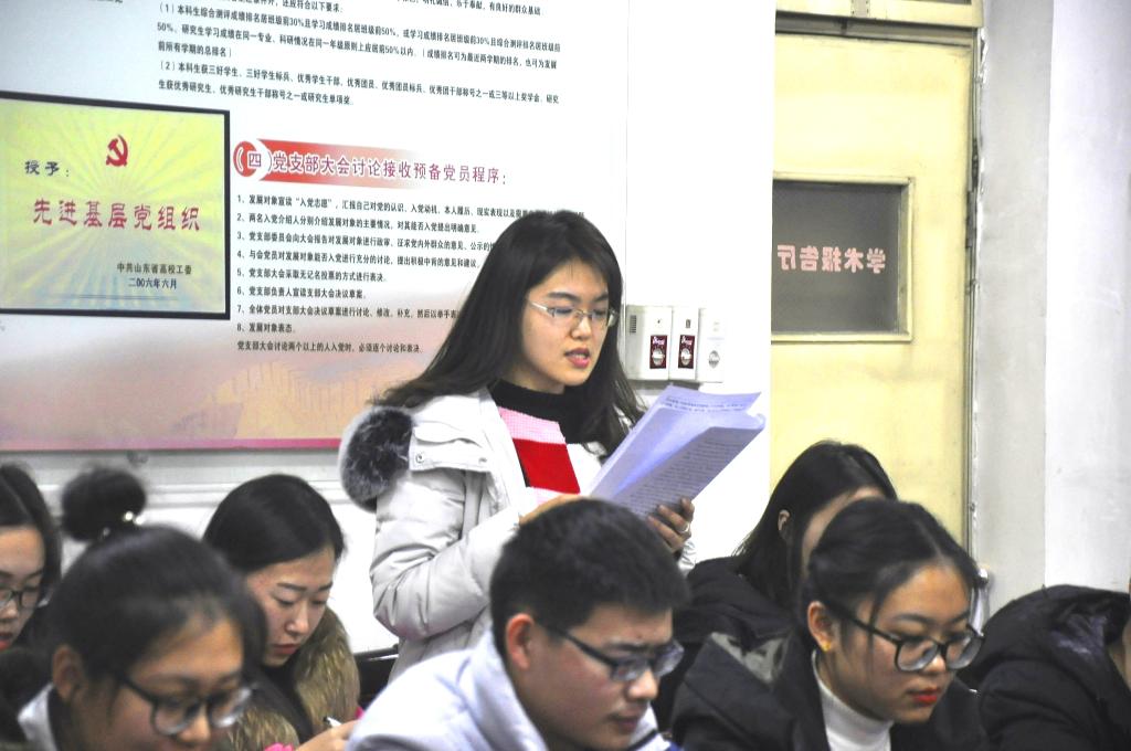 此次大会主要考察发展对象前期各方面综合表现,讨论决定预备党员的接收。刘书记在讲话中提到,入党是一件光荣而神圣的事情,青年学生要牢记十九大精神中民族的使命和责任担当,鼓励在座的学生党员以及发展对象要不忘初心,牢记使命,坚持自己心中那份执着,奋勇向前,并预祝即将参加考研的青年党员和学生取得理想的成绩。随后,吕皓银等11名发展对象逐一汇报各自情况,宣读入党志愿书并表明自己的入党动机,详细地汇报了预备期间个人在思想、生活、学习、工作等各方面表现,表达了他们坚定的入党动机和加入中国共产党的强烈愿望。入党介绍人依次对11名发展对象在预备期间优缺点各方面综合表现进行了认真仔细的汇报,介绍理由充分中肯,最后朱伟卫同志代表支部委员会就11名发展对象在一年的教育考察情况进行了综合说明。经过支委会报告综合政审情况以及正式党员进行无记名投票表决后,足球吧