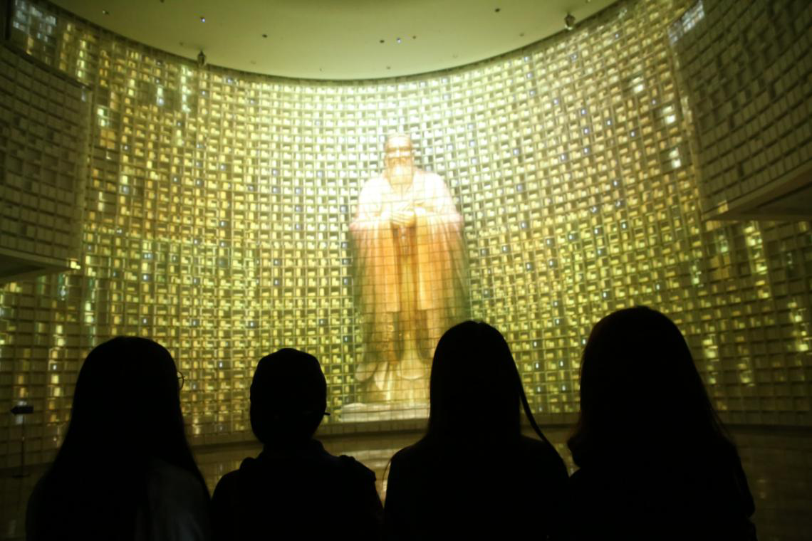 序厅环幕投影以“天不生仲尼,万古如长夜”短片为观众开启了追溯历史长河之旅。厅内圆形的书筒墙上装满了各种儒家典籍,恢弘壮观,体现儒家千年文脉的延续。孔子博物馆展现了孔子从治学弘道到教书育人,从人生哲学到治国理政,从反思历史到认识万物的思想智慧。