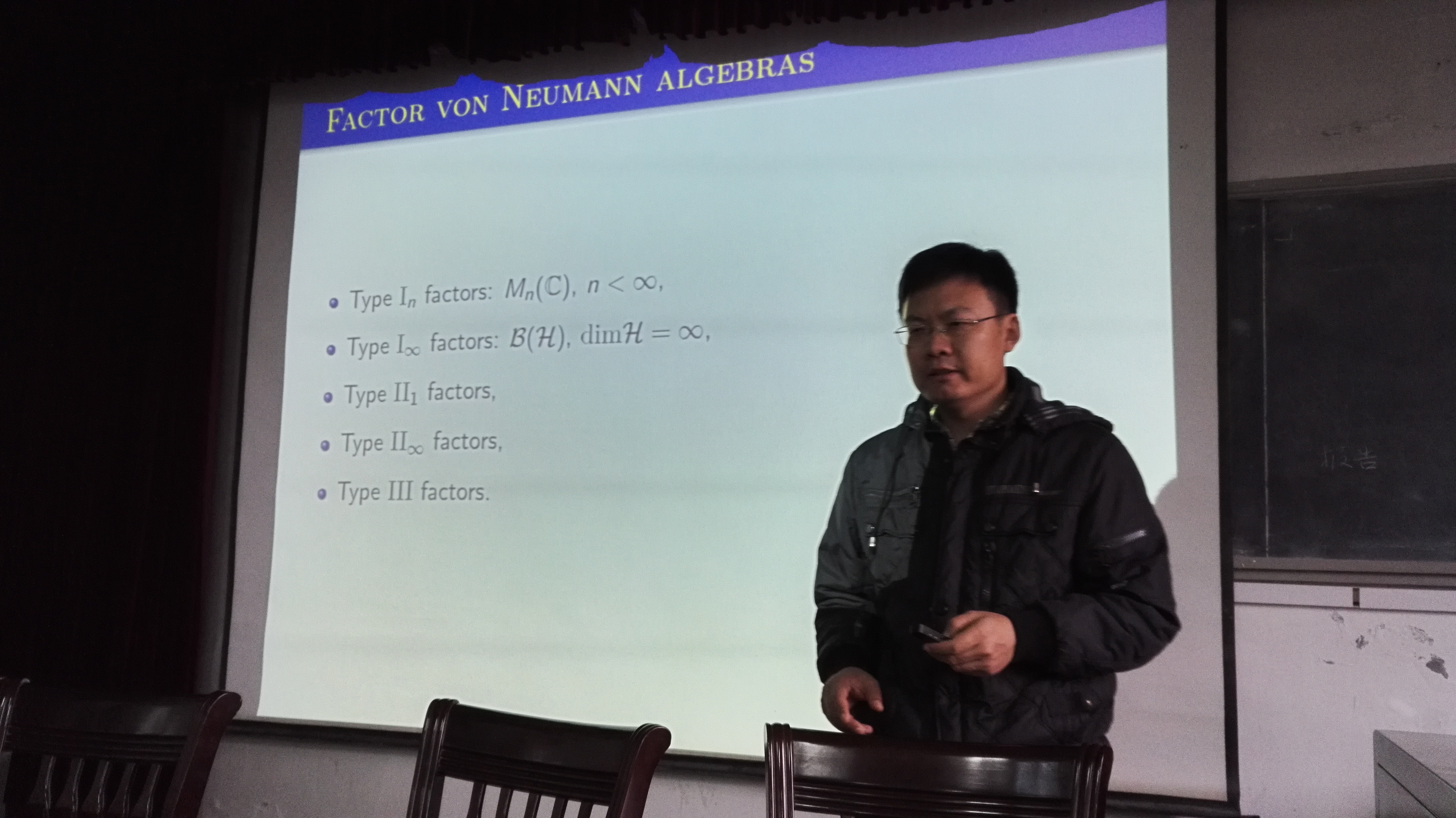 部分青年教师和研究生作了题为《On a class of operators in the hyperfinite type II_1 factor》的学术报告。